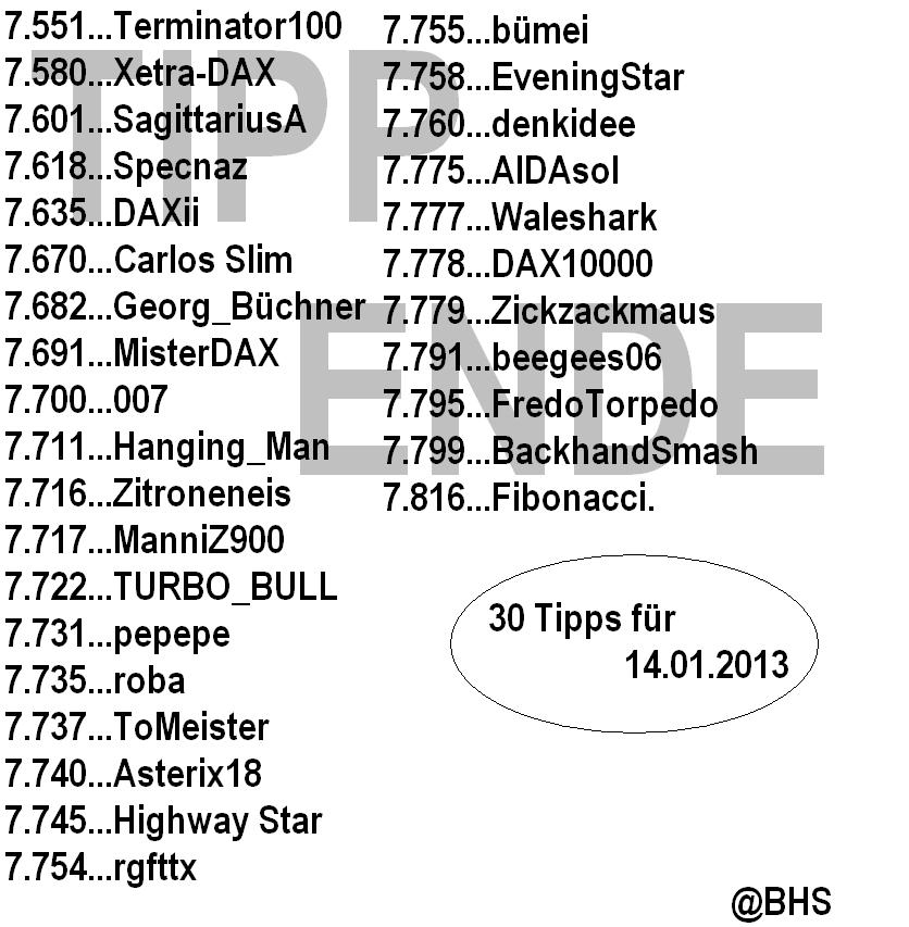 1.974.DAX Tipp-Spiel, Freitag, 11.01.2013, 17.45 Uhr, DAX 7.715,53