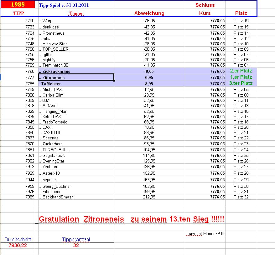 Gewinnerlinks 1.988.DAX Tipp-Spiel, Donnerstag , 31.01.2013, 17.45 Uhr, DAX 7.776,05