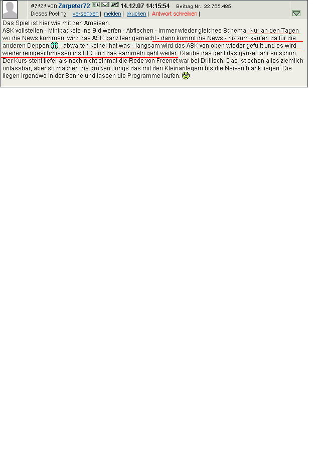 Keine Angst so paranoid bin ich nicht, auch noch zu posten, wenn ich keine Shares mehr habe. Ich muss sagen, leider habe ich viel zu viel davon. Hier werde keine Irritationen gepostet, sondern die nackte, beschissene Realität. PC hat es verhauen und ich möchte euch alle sehen, wenn in 6 MOnate die MOB immer noch nicht uns gehört ! Und gehen wir davon aus, dass die Sache mit dem Abbruch von UI und FRN Choulidis bekannt war, dann ist das doch noch schlimmer. Er hat es mit Dommi geplant, um UI und anderen grossen eine günstige KE zu ermöglichen. Ist das etwa gut. Ich bin nicht hart, mich kotzt es nur an, wenn ich sehe wie ein Vorstand unserer Firma schadet und es nicht schafft den Wert zu steigern, sondern uns immer mehr ins Abseits drängt. Die KE war der letzte Beweis dafür, dass sich PC einen Scheiss um den Kurs kümmert. Ist nun mal so, wer das nicht verstehen will, soll es lassen. Und die FRN HV hat es genauso verhauen, er hat es nicht geschafft die anderen Grossaktionäre auf seine Seite zu ziehen. Spoerr brauchte nur zu kommen und zu sagen, geil Leute ich verkloppe jetzt den ganzen Laden und das bringt viel viel viel mehr und schon sind alle abgesprungen und haben klein beigegeben und wertvolle Zeit verschenkt. Die PC Strategie war wohl zu schwammig oder zu wenig durchdacht oder was weis ich was. Telco war an sich gut, aber die 1. KE dieses Jahres dafür war auch ein Witz und hat das EPS zum 1. mal verwässert und jetzt das 2. Mal und immer haben wir noch nicht operatives dazugewonnen und es ist auch noch nicht absehbar, wann dies passieren wird. Und genau das kotzt mich, er lässt alle im Regen stehen, so darf man mit den Aktionären nicht umspringen, basta !