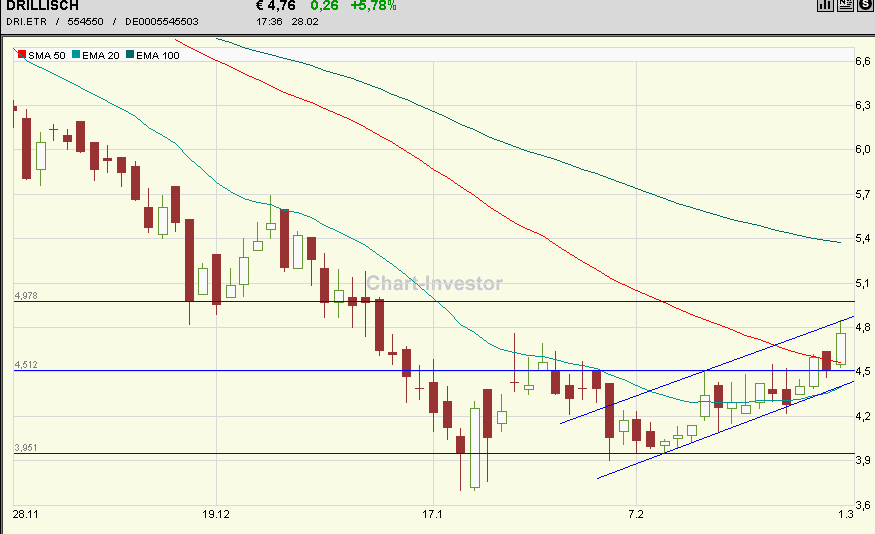 Die Aktie der Drillisch Ag kann in den letzte Tagen auch gegen den heute schwachen Trend deutlich zulegen. Nach einer Kaufempfehlung von SES Research gestern sollte nun wohl der Boden endgültig gefunden, und der Weg nach oben weiter frei sein. Das Drillisch-Kerngeschäft (Mobile Service Provider) werde derzeit gerade einmal mit knapp dem 2,5fachen erwarteten Jahresbrutto Cash Flow bewertet, hieß es in der Meldung.