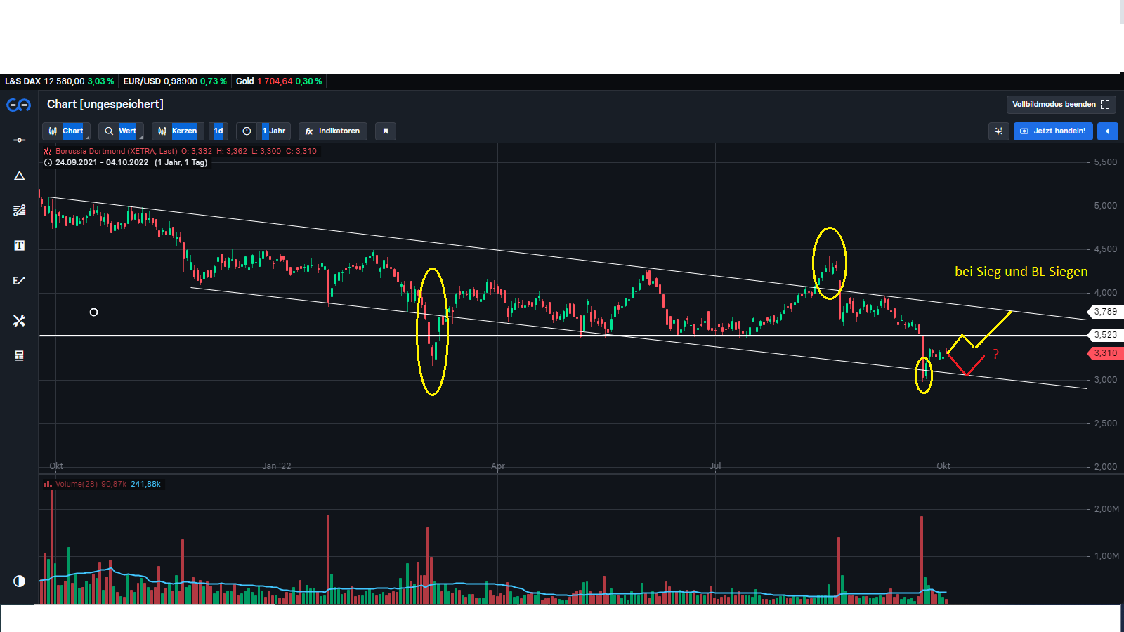 Allerdings nach letztem Rutsch (Übertreibung?) ist man nun zumindest wieder in den Kanal eingetaucht und bei € 3,30.- wird die BVB Aktie gekauft. Einen Sieg morgen könnte die BVB Aktie wieder an die € 3,50.- bringen...ob da dann schon ein Ausbruch Versuch statt finden könnte...wird schwer...aber wenn dann bis maximal € 3,80.-