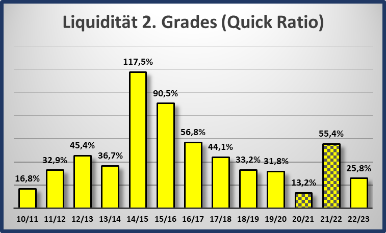 Ich habe ein Bild beigefügt, bei der die Kennzahl der Liquidität 2. Grades (Quick Ratio) jeweils zum Halbjahresbericht ab 10/11 bis 22/23 grafisch dargestellt wird. Die üblichen 100% für diesen Wert, konnten ab dem Halbjahr 14/15, zum Zeitpunkt der Veröffentlichung des Halbjahresfinanzberichtes, nie mehr erreicht werden.