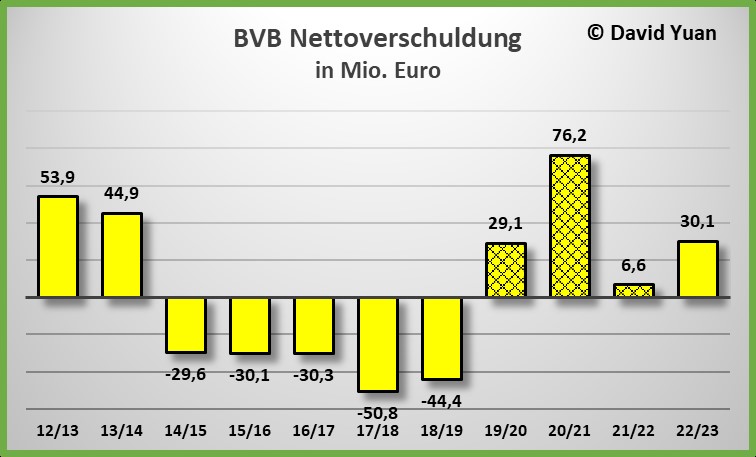 Hinweis zum Lesen des Diagramms: Die Zahlen über dem 0-Strich sind die (bösen) Zahlen zur Nettoverschuldung (Net Debt). Die Werte (-) unter dem 0-Strich sind die „guten“ Net Cash Zahlen.