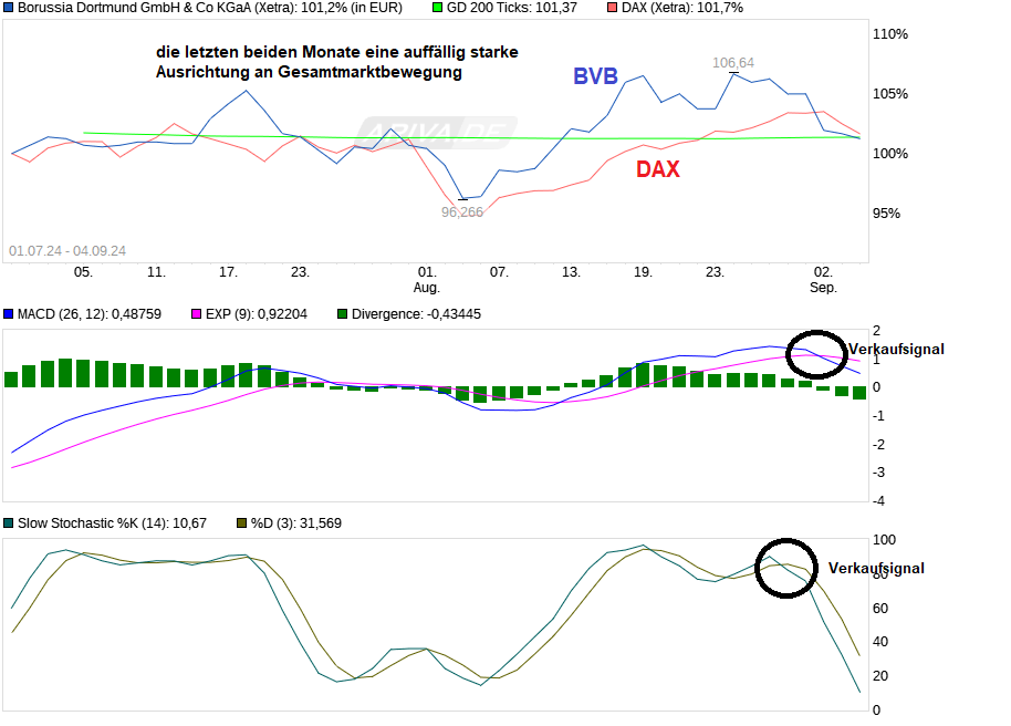 Wenn man sich mal die Entwicklung seit Anfang Juli anschaut, dann sieht man kaum noch nennenswertes Eigenleben bei der Aktie. Dafür wird sich stark nach der Gesamtmarktbewegung orientiert. Der Widerstandsbereich 3,85/90 scheint auch zubetoniert zu sein. Zudem seit Vorgestern ein Verkaufssignal im MACD und im Stochi bereits schon etwas eher. Mal abwarten wie lange diese Passivität bei der Aktie noch so bleibt. Wäre dann ja zu wünschen die US Arbeitsmarktzahlen fallen am Freitag so aus, daß der Gesamtmarkt zufrieden ist (Zinssenkungsphantasie bleibt) und nicht noch eine Stufe weiter absinkt. Zudem ist der September ist für die Börsen nicht unbedingt der Lieblingsmonat ( www.faz.net/aktuell/finanzen/...ber-kann-kommen-19952734.html )