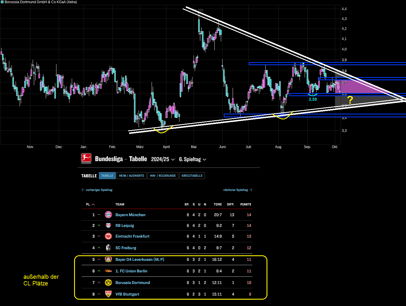 Also man sollte nicht Dinge schon zu diesem noch relativ frühen Zeitpunkt des Saison zu sehr dramatisieren. Nicht nur beim Tabellenfünften der letzten Saison ist etwas Sand im Getriebe. Läuft ja auch bei einigen der anderen Topmannschaften der letzten Saison noch nicht wieder so rund. So liegen aktuell weder der deutsche Meister Bayer Leverkusen, noch der VfB Stuttgart auf einem CL Platz. Wo bleiben die "Alonso raus" oder "Hoeness raus" Rufe? Mit aktuell 2 Punkten Rückstand auf einen CL Platz liegt der BVB nun noch immer sehr nahe an einem CL Platz und 84 Punkte sind noch erreichbar. Ist halt die grundsätzliche Frage im Raum, ob vielleicht die Mannschaft falsch zusammengestellt wurde oder der falsche Trainer am Ruder ist. Zur Winterpause kann man das vielleicht besser beantworten. Da man durch die bereits eher mäßigen Leistungen des BVB in der letzten BL Saison vorgewarnt war, sollte kaum jemand in dieser Saison nun Wunderdinge erwarten haben. Daher sollte der Aktienkurs durch eine Niederlage in der BL zu diesem Saisonzeitpunkt auch nicht zu sehr bewegt werden. Solange parallel in der CL die Chancen noch gewahrt werden die KO Runden zu erreichen, kann auch manches dadurch noch überdeckt werden.