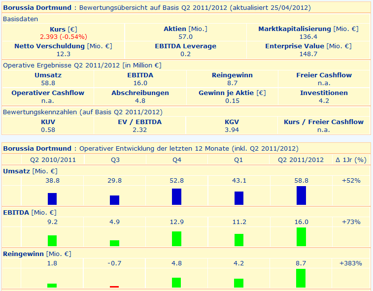 Klar, wenn ich wüsste, dass die Aktie jetzt um 20, 30 oder gar 50 Cent fallen würde, dann würde ich jetzt verkaufen und nach dem "Sommerloch" zurückkaufen. Was aber wenn es gar kein "Sommerloch" geben wird? Jetzt fangen Spekulationen um Spielerangebote an, Die EM, bei der ja nicht nur in der deutschen Mannschaft, sondern auch in der polnischen Mannschaft BVB-Spieler sind, könnte was bewirken (z.B. bzgl. eines dicken Angebots für Kuba). Mir persönlich ist es zu riskant, wegen der Hoffnung auf einen kleinen Gewinn, nicht mehr auf den Zug drauf zu kommen. Laut neuester Forbes-Liste ist der BVB ca. 300 Mio € wert - das sind nach Adam Ries ca. 5 € pro Aktie. Und für mich ist das schon eine sehr konservative, vorsichtige Bewertung! Wenn man Kader, Stadion, Management, Fans, Marke BVB, etc... nüchtern Kopf bewertet, dann wird man erkennen, dass die BVB-Aktie noch unglaubliches Potential hat. Ich glaube, dass irgendwann eine sehr deutliche Kurskorrektur kommt. Zur Erinnerung: der FCB soll über 1 Mrd. € wert sein. Der BVB nur 150 Mio €? Da lachen echt die Hühner....