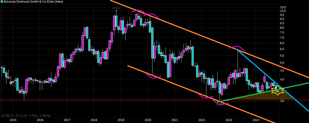 Dennoch ist das Unternehmen klar unterbewertet. Deshalb sehe ich eigentlich selbst bei weiteren Niederlagen demnächst das maximale Abwärtspotenzial beim Tief der letzten Jahre von 2,9-3,0 €. Nach oben wüsste ich jetzt aber auch nicht, wieso wir über 3,9 € gehen sollten. Dafür bräuchte es irgendeinen sportlichen oder finanziellen Trigger.