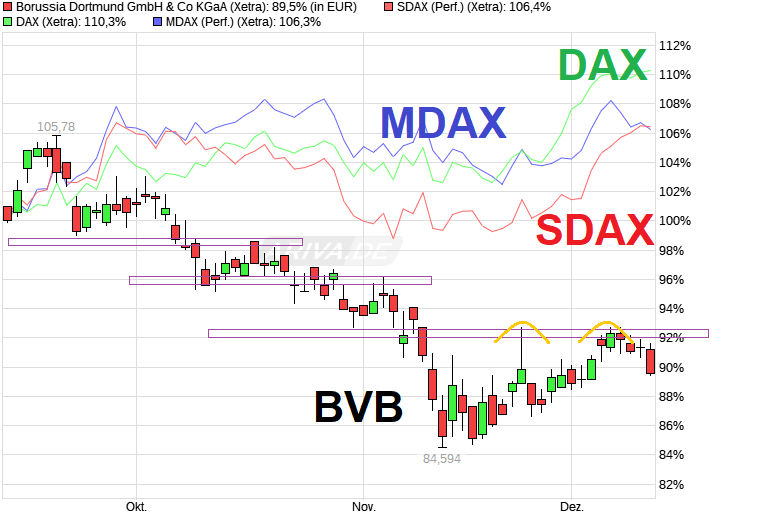 Einfach mal ganz simple gerechnet: Angenommen das Unternehmen BVB wird liquidiert, dann wäre der Liquidationserlös höher als die Börsenbewertung. (Ob wir nun den Kader für 400 Mio verscherbelten oder für 550 Mio versteigern würden). Neben dem Kader gäbe es aber auch noch andere Vermögenswerte, wie das Stadion, das Trainingsgelände usw. Der Liquidationswert gilt als absolute Untergrenze einer Bewertung. Daher komme ich bei der BVB Aktie auf eine deutliche Unterbewertung.