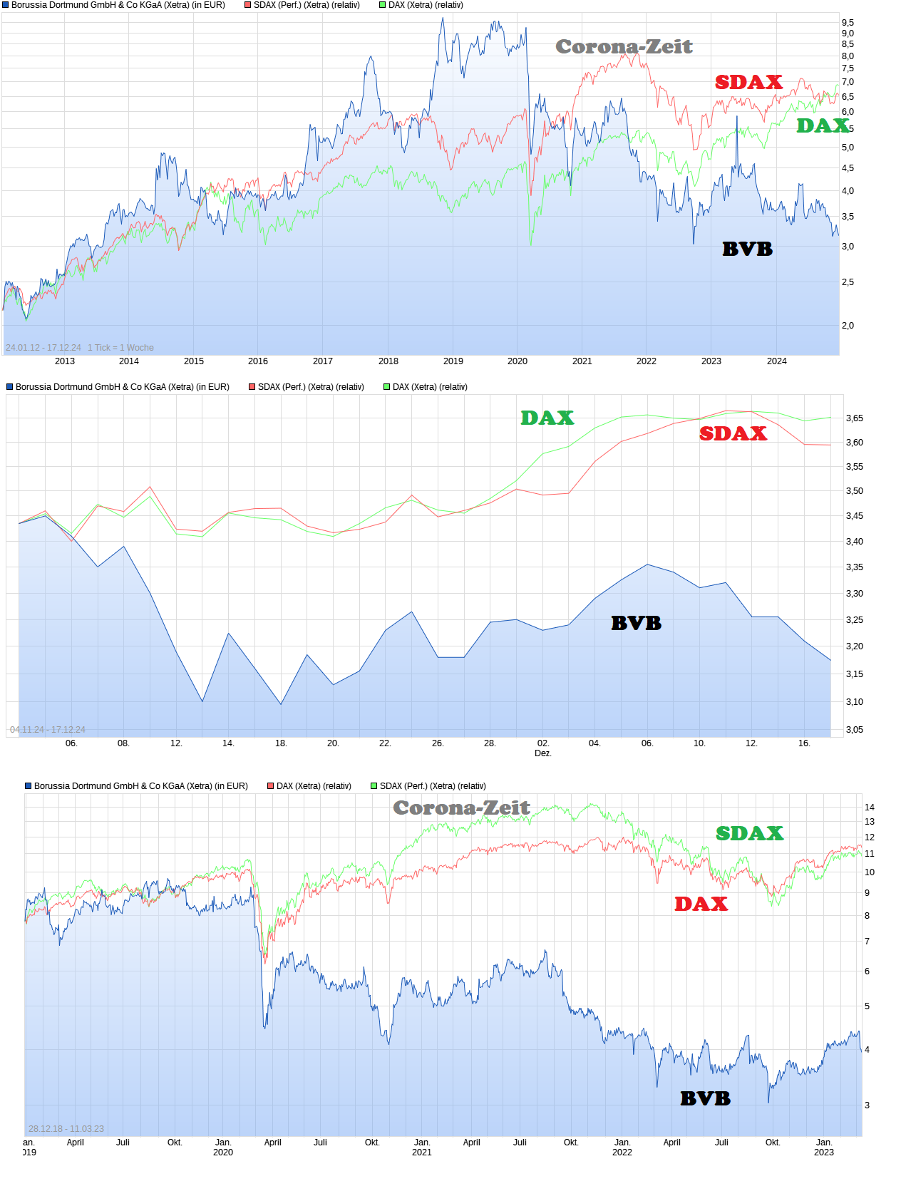 Also wenn ich mir dann mal die Realitäten anschaue im Chart, dann ergibt sich für mich eher folgendes Langfrist-Bild: Der DAX hat in diesem Jahr lediglich zum lange sehr gut gelaufenen Nebenwert-Index SDAX, der in der Corona-Zeit besser gelaufen war als der DAX, Boden wieder gutgemacht. Da sehe ich weniger sonderliche Nebenwert-Schwäche, sondern mehr eine Art Wiedererstarkung der Big Caps. Somit ist der zuletzt gute Anstieg des DAX bzw. der großen Werte aus meiner Sicht nur eine Art Normalisierung gegenüber dem was Nebenwerte in der Vergangenheit schon vorgelegt hatten. Unabhängig davon gibt es übrigens ja auch viele Einzelwerte aus dem Nebenwerte-Bereich die auch besser gelaufen sind als der große DAX. Wichtig ist also besonders die richtigen Werte sich auszusuchen und weniger zu schauen in welchem Index die sind. Und wenn ich dann auf den Kursverlauf der BVB-Aktie schaue, dann hat das doch mit dem Verlauf des Nebenwerte-Index SDAX nur wenig gemeinsam. Da gibt es aus meiner Sicht eher individuelle Gründe für diese Diskrepanz zwischen den Indizes und dem Verlauf des Einzelwertes BVB. Muß natürlich jeder für sich selber entscheiden, ob es die gesonderten Gründe hinreichend sehen will oder glaubt es wäre ja hier lediglich alles wie bei allen Nebenwerten und es gibt keine sonderlichen individuellen Gründe bei dem Wert.