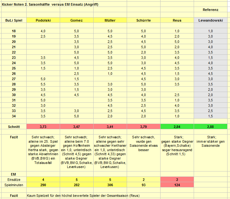 Ich bin niemand der immer die Schuld beim Trainer sucht aber Löw geht gar nicht mehr! Der hat so viele Fehler gemacht! Schweinsteiger, Poldi überhaupt nicht in Form! Gomez passt nicht ins System! Beten wir das Klopp den Schieber hinbekommt oder Favre den Mlapa (schießt in der U21 Tore, Buli bis jetzt schwach)! Klose wird 2014 keine große Rolle mehr spielen mit 36! Wir brauchen unbedingt einen spielstarken Stürmer! Ansonsten muss vielleicht sogar Reus ganz vorne rein!