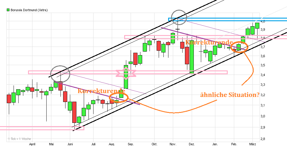 ...wenn sich die Situation wieder so auflösen würde wie Ende letzten August/Anfang September 2013, wo man das Top der damaligen Seitwärtsrange knackte und dann ein neuer Dynamikschub folgte. Bis zu einem neuen Xetra-Hoch sind es ja nurnoch wenige Cent. Nach unten ist man im Bereich 3,80/85 erstmal gut abgesichert, das Weiterkommen in die nächste CL Runde ziemlich sicher und auch in der BL ist die Platzierung gut dank eigener Leistung und straucheln der direkten Verfolger. Würde mich daher nicht wundern, wenn im März Kurse jenseits der 4,03 auf Xetra zu sehen wären.