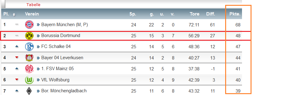 Und wie gesagt, Wolfsburg konnte selbst beim Tabellenletzten nicht gewinnen und ist inklusive Torverhältnis immernoch 9 Punkte weg. Das Mainz das durchhält, ist auch unwahrscheinlich. Leverkusen spielt auch schlechter als der BVB. Also warum sollte der Kurs sinken? Klar könnte es Montag 3-4 Cents runter gehen. Ich bin mir aber sicher, am Donnerstag wird der Kurs bereits wieder mindestens auf 3,98-4,03 steigen. Den Ausbruch über 4,03 € erwarte ich weiter in der letzten Märzwoche.