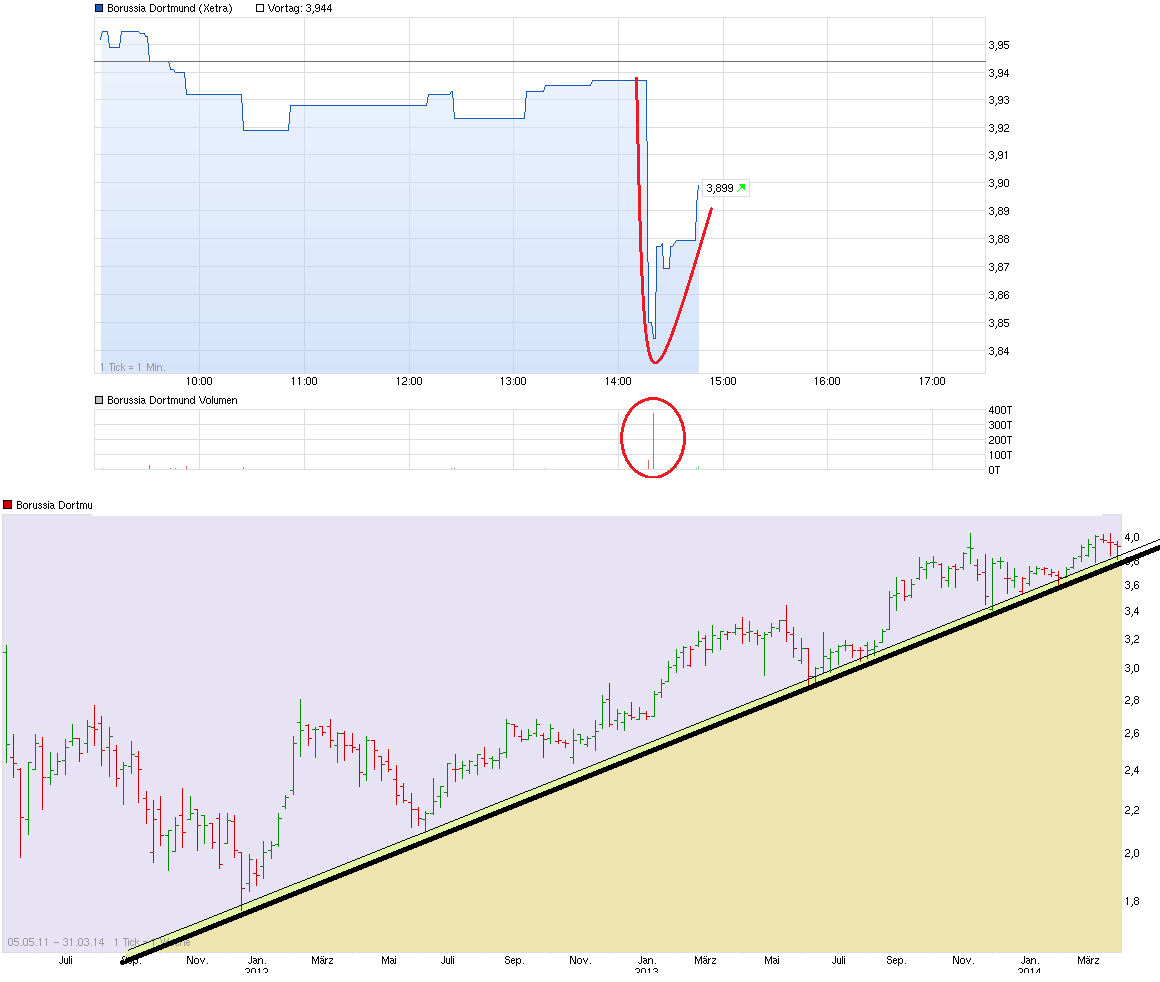 Nach der Niederlage gegen Wolfsburg am 9.11.2013 habe ich BVB Aktien verkauft. Der XETRA Eröffnungskurs lag bei 3,754. Meine Spekulation war folgende, die Niederlage an sich ist nicht wirklich dramatisch, wohl aber die Kombination aus verschiedenen Fakten.
