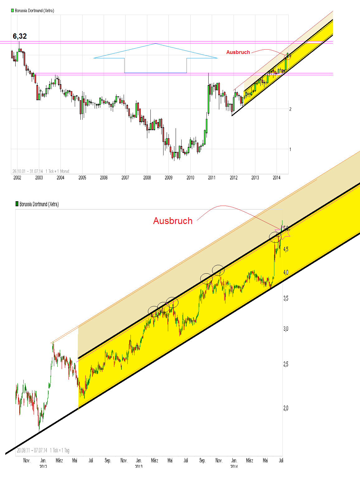 Bin auch etwas erstaunt wie locker der Kurs zuletzt weitermaschiert ist. Hätte mir auch vorstellen können man konsolidiert zwischenzeitlich doch nochmal etwas länger. Aber die SDAX Aufnahme ( und vielleicht auch das erhöhte Interesse an Fußball während der WM) hat dem Wert guten Schub und Aufmerksamkeit gegeben. Und die KE für Evonik und potenzielle weiter KEs scheinen auch von den meisten Anlegern begrüßt zu werden, da man mit den Mitteln weiter an den Platzhirsch Bayern München ranpirschen dürfte und das den BVB mittel- bis langfristig noch werthaltiger werden läßt. Vermutlich hat es auch dem Kurs nicht geschadet aus dem gelben Kanal der letzten Jahre (siehe Chart unten) nach oben ausgebrochen zu sein. Wirkt auch als Kaufsignal. Hat ja lang genug gedauert bis hier der Durchbruch kam. Jetzt wäre oben das nächste größere potenzielle (Zwischen-)Ziel wohl die Marke um die 6,32. Wobei man natürlich vermeiden sollte bei zwischenzeitlichen Rücksetzern bis dahin wieder unter die bislang deckelnde Linie wieder zurückzulaufen. Ein steigender Kurs ist mometan auch vorteilhaft, weil man so bei weiteren KEs (die wohl mit hoher Wahrscheinlichkeit kommen dürften) klar bessere Ausgabekurse bekommen wird, d.h. damit mehr Geld pro KE reinkommt wie bei der Evonik KE. Hat man mit Puma vielleicht intern ausgemacht zu einem höheren Kurs erst die KE zu machen? Könnte ja sein man wartet jetzt erstmal bis der Kurs irgendwo jenseits der 5,50 ist und macht dann erst die nächste Adhoc. Dann wäre der KE Kurs zwar höher als der von Evonik, aber ebenfalls marktkonform und die Puma-Aktionäre können nicht sagen man hätte über dem Marktkurs gekauft. Aber vielleicht liegt das Zögern auch daran, daß man sich auch noch im Detail einigen muß über neue langjährige Konditionen des Ausrüstervertrags mit Puma. Schätze es wird ähnlich wie bei Evonik ein "Paktet" geschnürt aus KE plus verbessertem Marketing/Ausrüstervertrag. (=> www.handelsblatt.com/unternehmen/...sia-dortmund/10129648.html "...Die Wahrscheinlichkeit sei groß, dass es im Sommer zu einem Abschluss komme. Allerdings stünde eine Einigung nicht unmittelbar bevor, sagten Insider. )