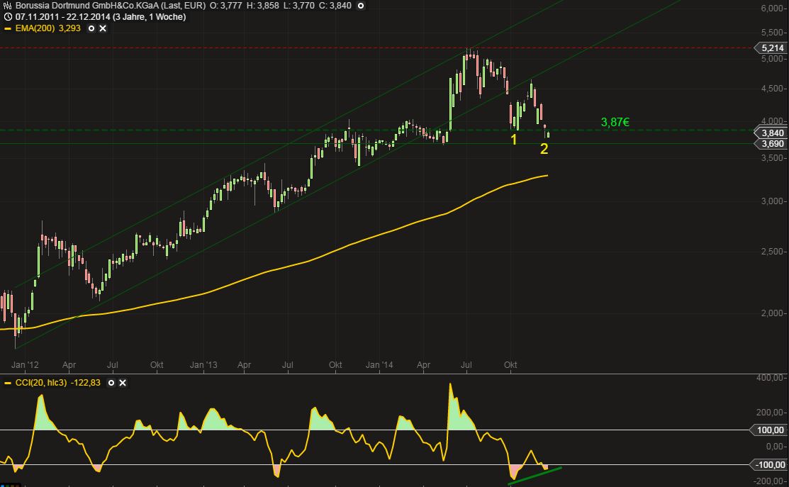 Nun einige Wochen später ist die Zwischenrunde Geschichte. Von internationalem Wettbewerb kann keine Rede mehr sein. Das Abstiegsgespenst geht um. Es herrscht allgemeine Ratlosigkeit. Die Stimmung ist am Boden. Kurs: 3,84€. Das Tief des Bullish Engulfing wurde zwar während der Woche unterschritten, jedoch auf Wochenschlusskursbasis mit einem Hammer verteidigt (gelbe Zwei). Und auch dieser Hammer drückt aus, dass sich die Bullen noch einmal zurückkämpfen konnten. Trotzdessen sich die sportliche Situation derart verschlechtern hat, scheint der Bereich um die 3,90€ bis 3,80€ (max. 3,69) weiterhin eine nachhaltige Unterstützung darzustellen, die ich wirklich nur bei einem Abstieg zeitweilig in Gefahr sehe.