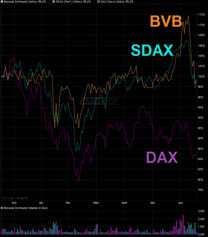 Wie der BVB im Verhältnis zum DAX performt, siehst Du hier: