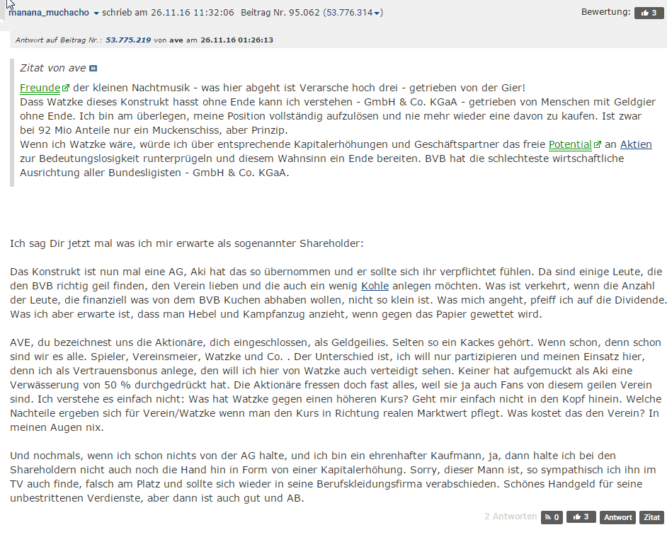 Nachdem Watzke 2013 die Dividende eingeführt hatte, der „natürlich“ von Geske abgesegnet wurde (umso mehr verwunderlich denn Geske wurde doch immer als „Aktionär aus echte Liebe“ dargestellt), wurde das Ding auch sofort von einem gewisser „Experten“ Kränzle (wovon längst klar gewesen dass er alles-mögliche angreife um den Kurs klein zu reden) aufgegriffen als extra vorhandenes Werkzeug.