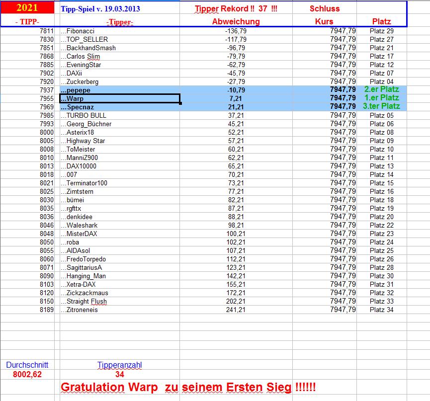 Gewinnerlinks 2.021. DAX Tipp-Spiel, Dienstag , 19.03.2013, 17.45 Uhr, DAX 7.947,79