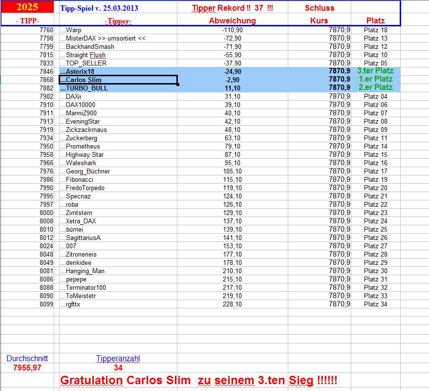 2.025. DAX Tipp-Spiel, Montag , 25.03.2013, 17.45 Uhr, DAX 7.870,90