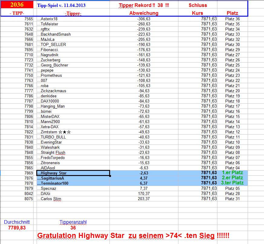 Gewinnerlinks 2.036. DAX Tipp-Spiel, Donnerstag , 11.04.2013, 17.45 Uhr, DAX  7.871,63