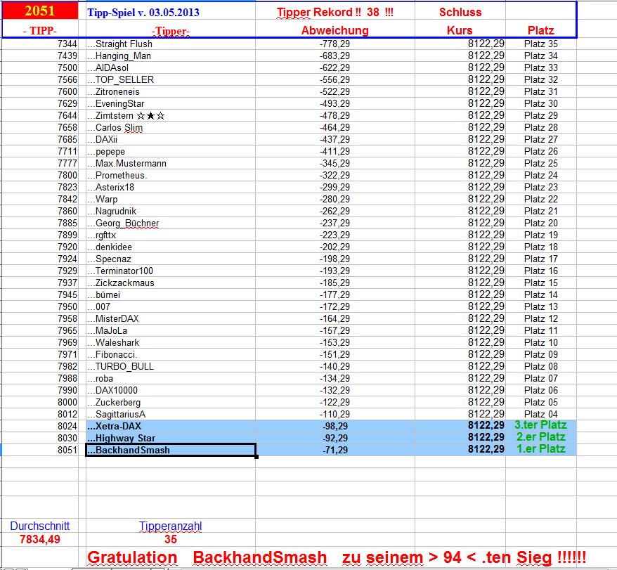 Die DAX-Tipp-Spiel-Sieger vom 19.4.05 - 03.05.2014