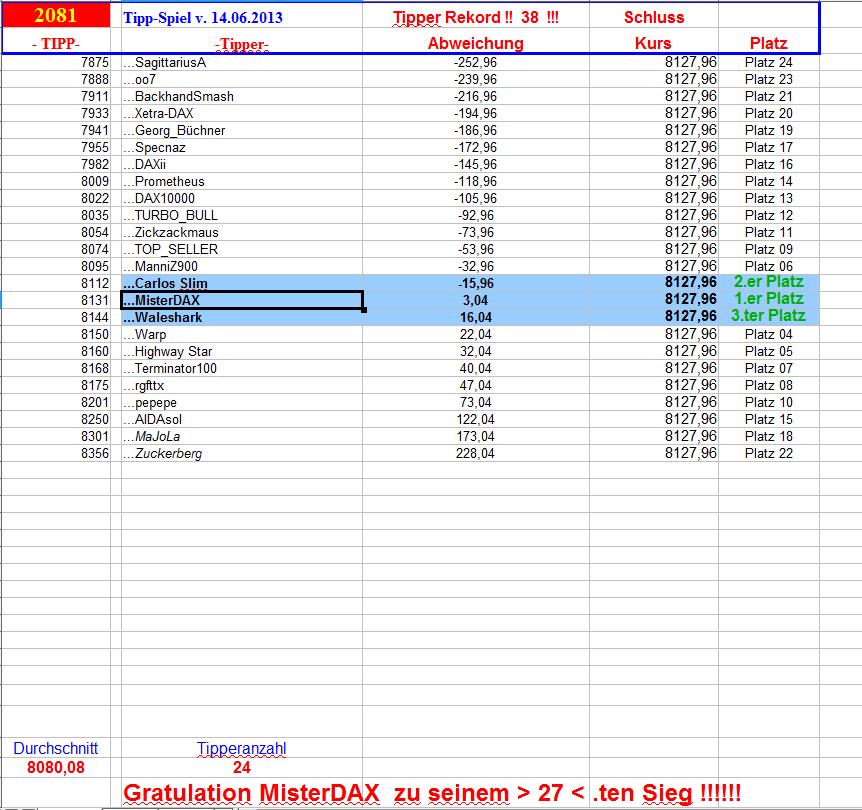 2.082.DAX Tipp-Spiel, Montag, 17.06.2013,17.45 Uhr, DAX ....???
