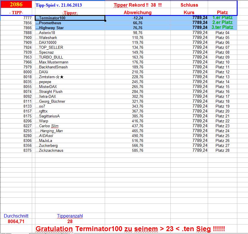 Gewinnerlinks 2.086. DAX Tipp-Spiel, Freitag 21.06.2013, 17.45 Uhr, DAX 7.789,24