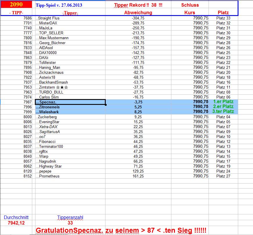 Gewinnerlinks 2.090. DAX Tipp-Spiel, Donnerstag 27.06.2013, 17.45 Uhr, DAX 7.990,75