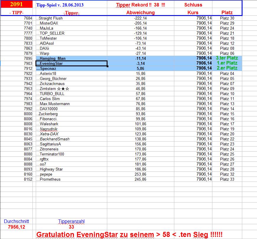 Gewinnerlinks 2.090. DAX Tipp-Spiel, Donnerstag 27.06.2013, 17.45 Uhr, DAX 7.990,75