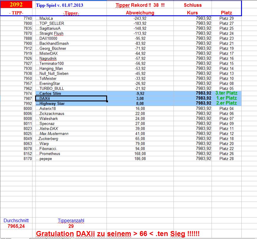 2.093.DAX Tipp-Spiel, Dienstag, 02.07.2013