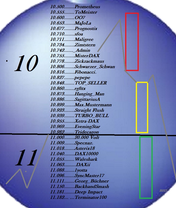 10.500.......Prometheus 10.555.......ToMeister 10.600.......OO7 10.653.......MaJoLa 10.677.......Prognostix 10.710.......sfoa 10.711.......Maligree 10.734.......Zimtstern 10.742......_Admin 10.755.......MisterDAX 10.778.......Zickzackmaus 10.806.......Schwarzer_Schwan 10.816.......Fibonacci. 10.827.......pepepe 10.848.......TOP_SELLER 10.860.......rgfttx 10.873.......Hanging_Man 10.886.......SagittariusA 10.899.......Max.Mustermann 10.923.......Straight Flush 10.939.......TURBO_BULL 10.955.......Xetra-DAX 10.969.......EveningStar 10.982.......Tridecagon 11.000.......20.000 Volt 11.009.......Specnaz. 11.018.......Asterix18 11.040.......DAX10000 10.055.......Waleshark 11.063........DAXii 11.088.......1yotta 11.096.......SyncMaster17 11.111.......Georg_Büchner 11.150.......BackhandSmash 11.181.......Deep Impact 11.182... ...Terminator100