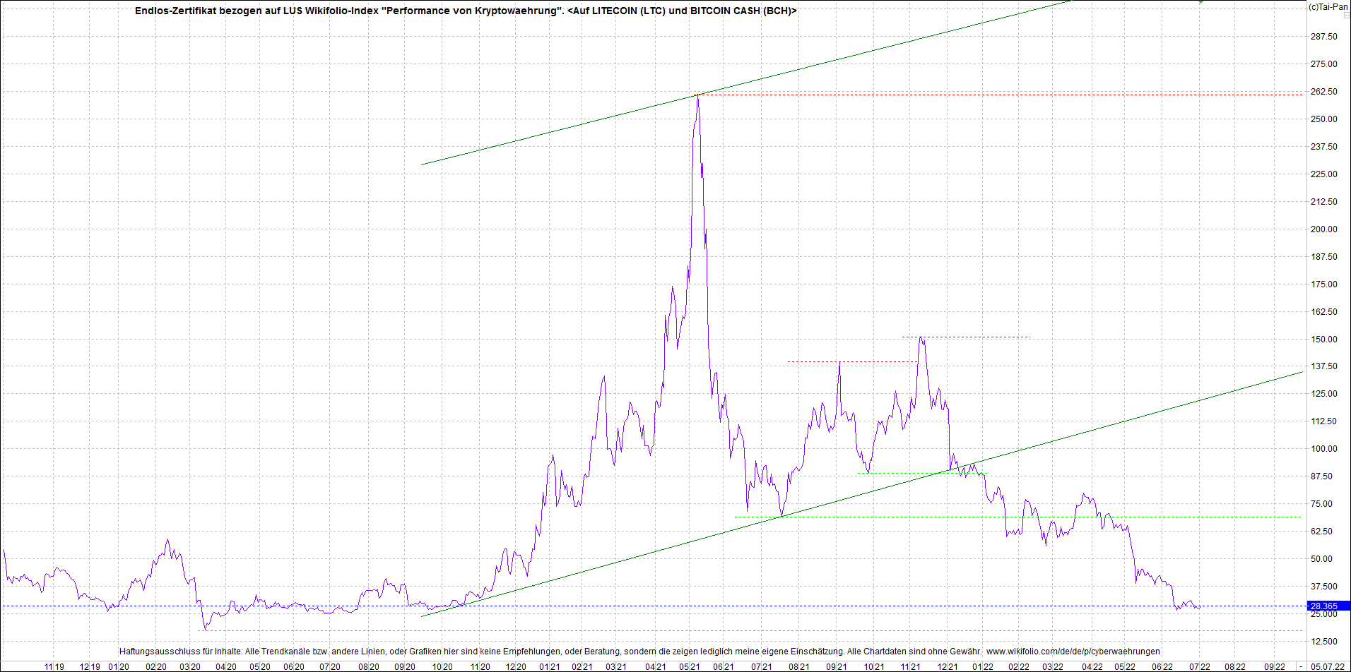 Anbei das Zertifikat, bekannt als: Endlos-Zertifikat bezogen auf LUS Wikifolio-Index "Performance von Kryptowaehrung",  jetzt versorgt mit Performance von Litecoin (LTC) und von Bitcoin Cash (BCH).