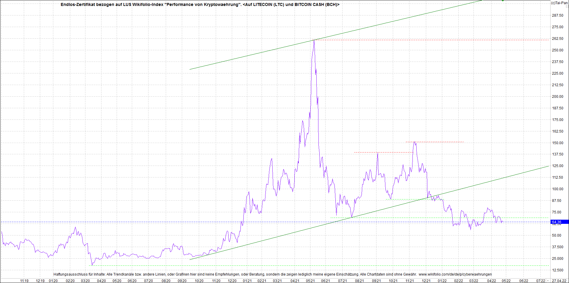 Anbei das Zertifikat, bekannt als: Endlos-Zertifikat bezogen auf LUS Wikifolio-Index "Performance von Kryptowaehrung",  jetzt versorgt mit Performance von Litecoin (LTC) und von Bitcoin Cash (BCH).