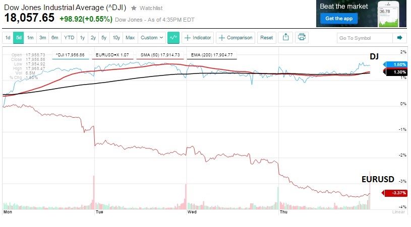 im Vergleich zum EURUSD ersieht man, schwacher EUR starker USD zieht Geld aus DJ ab .. Geld fließt dorthin, wo es am meisten Profit bringt ..