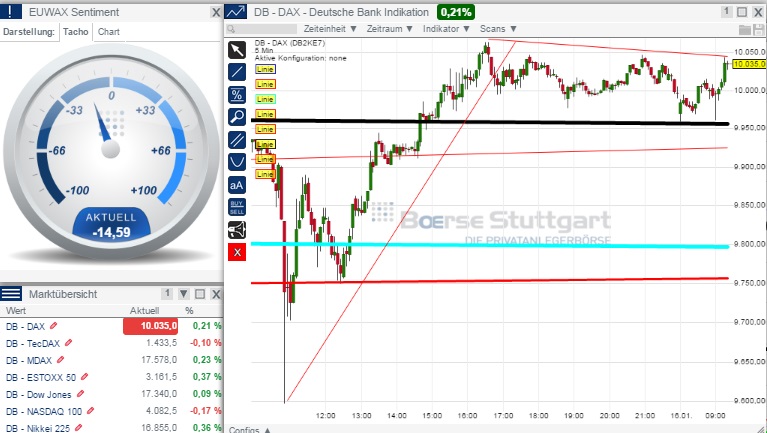 Durch den Anstieg über 9980 wurde prinzipiell auch ein untergeordnetes 60 min Chart Kaufsignal für das Ziel 10190/10230 ausgelöst, was sich aber mit der Tageschartprognose beißen würde, die ja vor dem Ansteuern von ca. 8900/9020 keine neuen Hochs über 10090/10120 sehen möchte (nur in seltenen Überschussvarianten von bärischen Flaggen wäre das zeitweise denkbar).