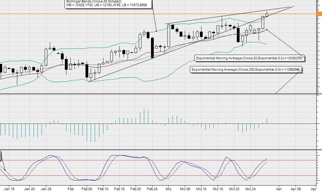 Was ist eigentlich passiert? Das gestern gezeigte Insel-GAP zu Montag wurde im DAX nicht geschlossen. Damit kam am Nachmittag eine andere Stoßrichtung in den Markt und mit ihr ein Ausbruch auf der Oberseite. Angehalten wurde im XETRA-Handel genau am Zweijahreshoch!