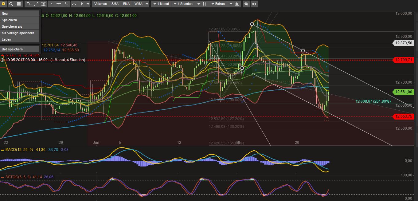 Fazit: Der DAX bewegt sich vorerst wahrscheinlich zwischen 12491 und 12741 (Tagesschluss zählt). Bullisch wird es erst wieder über 12840.