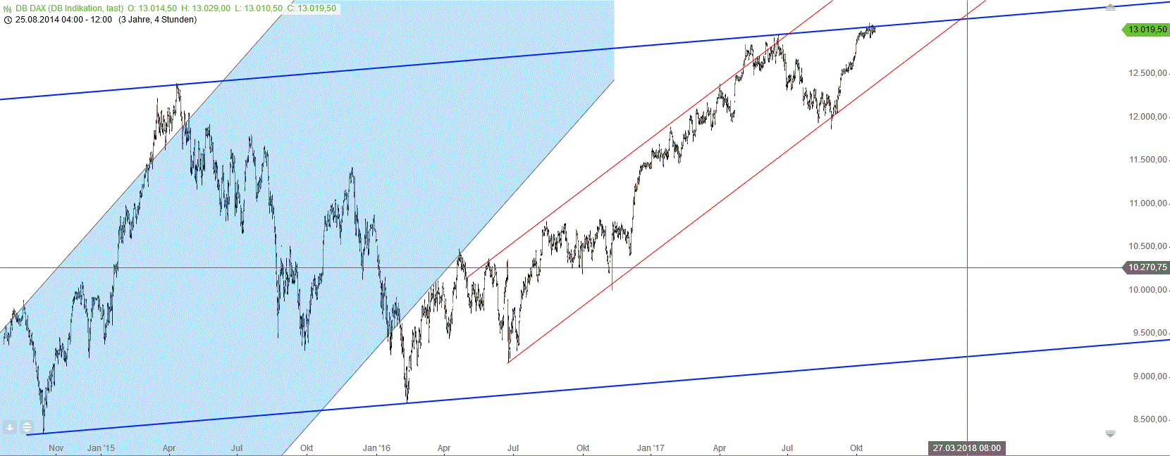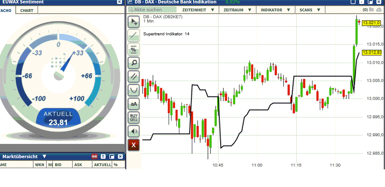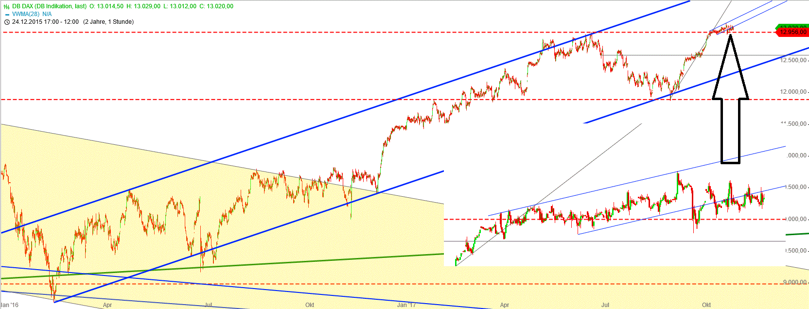 betreiben und lediglich das Volumen der monatlichen Ankäufe etwas senken, aber fällig werdene Anleihen weiterhin brav reinvestieren, so dass die aufgeblähte Bilanz der EZB da bleibt, wo sie momentan ist, während die Geldpolitik der FED bereits deutlich weniger expansiv wird. M.M. nach wird Draghi genau das morgen verkünden, die Märkte fühlen sich dann, wie so oft in der Vergangenheit, mal wieder in ihrer Grunderwartung bestätigt und der Markt wird ggf. nur mit einem kleinen Abschütteler oder Spike in beide Richtungen reagieren. Also morgen eine kleine Marktbereinigung im Dax und das Spiel beginnt von vorne. Die lockere Geldpolitik der EZB wird uns sicherlich noch länger begleiten. Für Überraschungen ist der Weihnachtsmann zuständig.