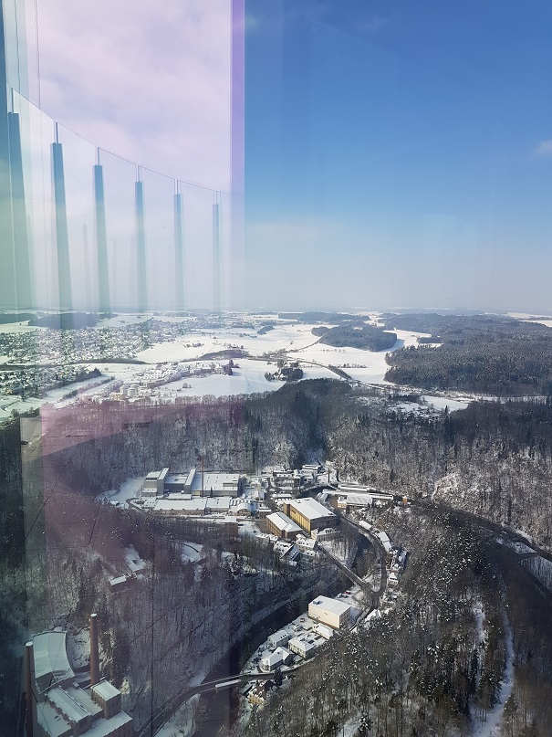 aus dem Büro von tuorT`s Büro in 230m höhe.Zu ehren seines Musterschülers hat er noch die grosse Fahne rausgeholt mit der Aufschrift "Eure Armut kotzt mich an"