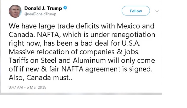 Trump sagt klipp und klar, Zollschranken werden nur fallen, wenn es einen neuen und fairen NAFTA Deal gibt. NAFTA betrifft Mexiko und Kanada. Die gestrigen NAFTA Verhandlungen sind trotz diesem Druck gescheitert. Trump ist es ziemlich egal, ob nun die EU oder sonstwer Zollschranken aufbaut. Für ihn ist sein Wahlversprechen wichtig, NAFTA nur, wenn alles besser wird - für US ..