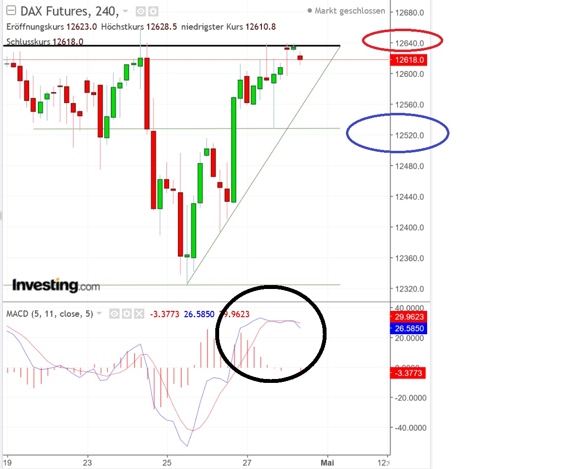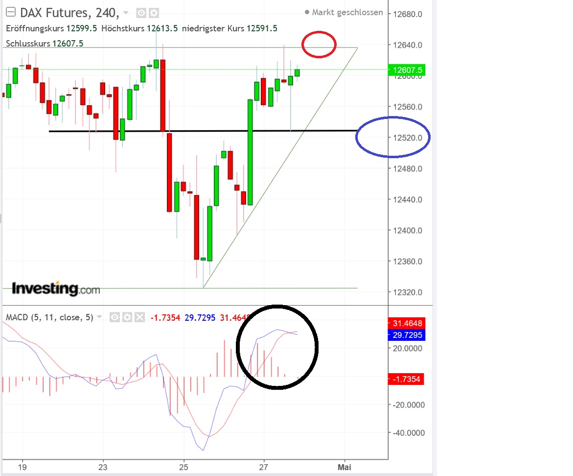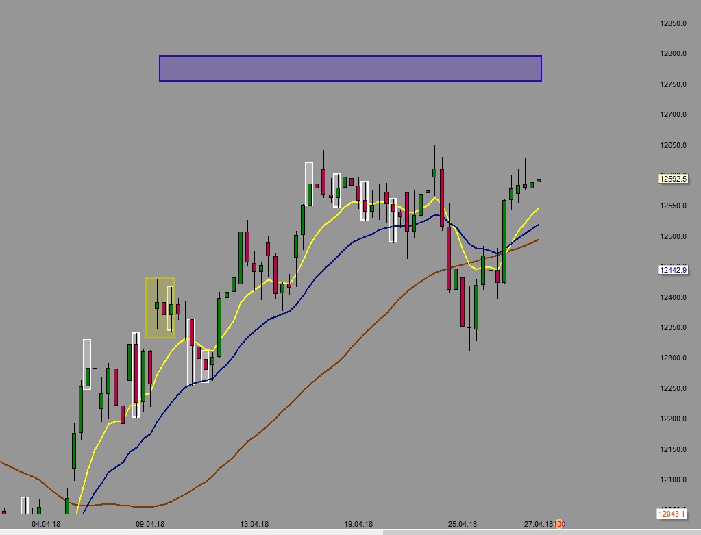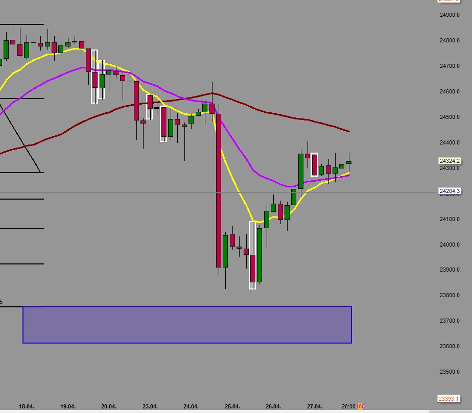 Der Mai steht vor der Tür und es riecht förmlich danach, dass eine Richtungsentscheidung nun endlich in der Luft liegt. Nur wenn ein Tagesschluss über 24.859 gelingt, entspannt sich die Situation für die Bullen etwas.