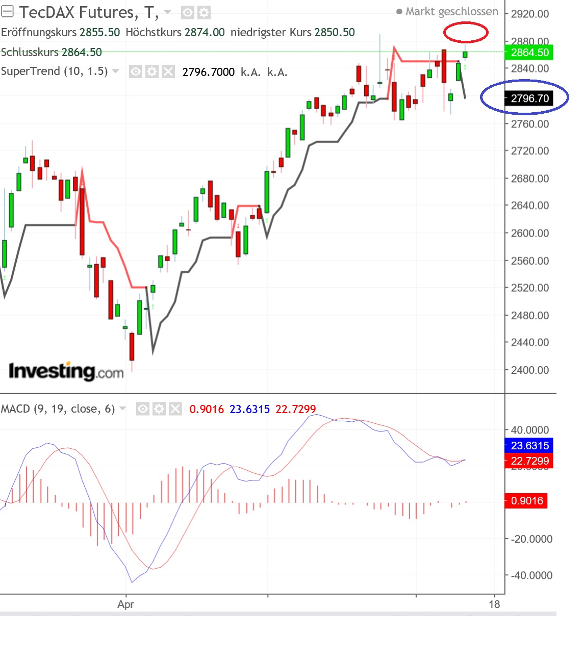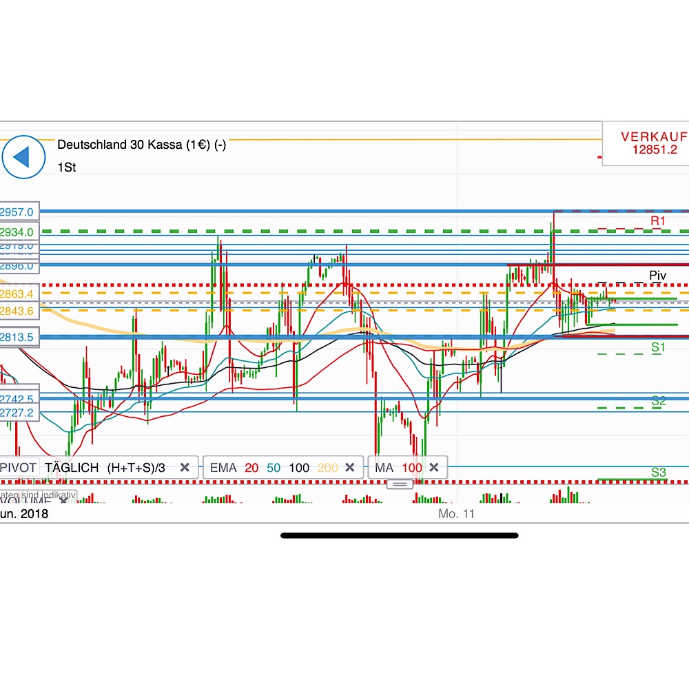 ME schwierig einzuschätzen, da es auf den höheren Zeitebenen keine überzeugenden Trends gibt. Die wesentlichsten Bereiche sind offensichtlich, oben 12900 - 12957 unten 12790-12820 (EMA200/4h/1h, S1, TTs, unteres Ende der 4h Außenkerze, MA100/h etc.) Da muss es mE erst mal durch, um überhaupt an einen short Einstieg denken zu können. Interessant wäre insb. ein 4h Schluss unter 12813,5. Weiter unten hätte ich vorerst 12725-12730 (TTs, S2) am Zettel, wobei diese Unterstützungszone nicht so massiv wie obige wäre. Noch weiter unten bliebe 12610-12650 (horizontale Unterstützungen, S3, 50er Retr. der großen Abwärtsbewegung im Feb.). Spätestens bei 12550 wäre es dann wohl nicht das dümmste allfällige Shortgewinne mitzunehmen. Oberhalb der 12820 bis 12880 hätten wir wohl ein wahlloses Seitwärtsgeschiebe innerhalb der h-Außenkerze. In dem Bereich liegen mit dem XETRA-Schluss, dem 61er Ret. o.a. Abwärtsbewegung und dem PP Marken zwischen denen es hin und her laufen könnte. Darüber (insb über 12900) wären vorerst die 12957 erreichbar, wobei da auch einige Tageshochs, die gestrige Kassseröffnung etc liegen und bremsen könnten. Gehts auch da drüber wären neben den 13000 und R2,R3 die 13038 und max die 13150 mögliche Ziele. Vorerst interessant wäre einmal ein 4h Schluss über dem Hoch der Außenkerze (12957). Ich habe momentan jedenfalls keinerlei Tendenz und warte mal ab.