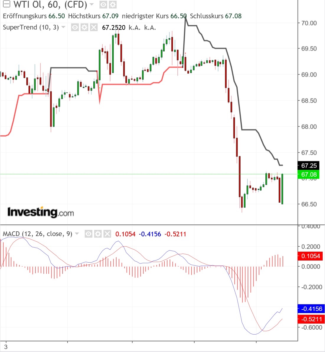 Rückblick: Der Ölpreis geriet gestern massiv unter Druck und verließ den mehrtägigen, aufwärts gerichteten Keil nach unten. In der Folge rutschte er bis fast ans untere Ende der mehrwöchigen Seitwärtsrange zurück. Dort startete eine kleine Erholung, welche im heutigen frühen Handel fortgesetzt wird. Mit dem Einbruch hat sich das sehr kurzfristige Bild eingetrübt.