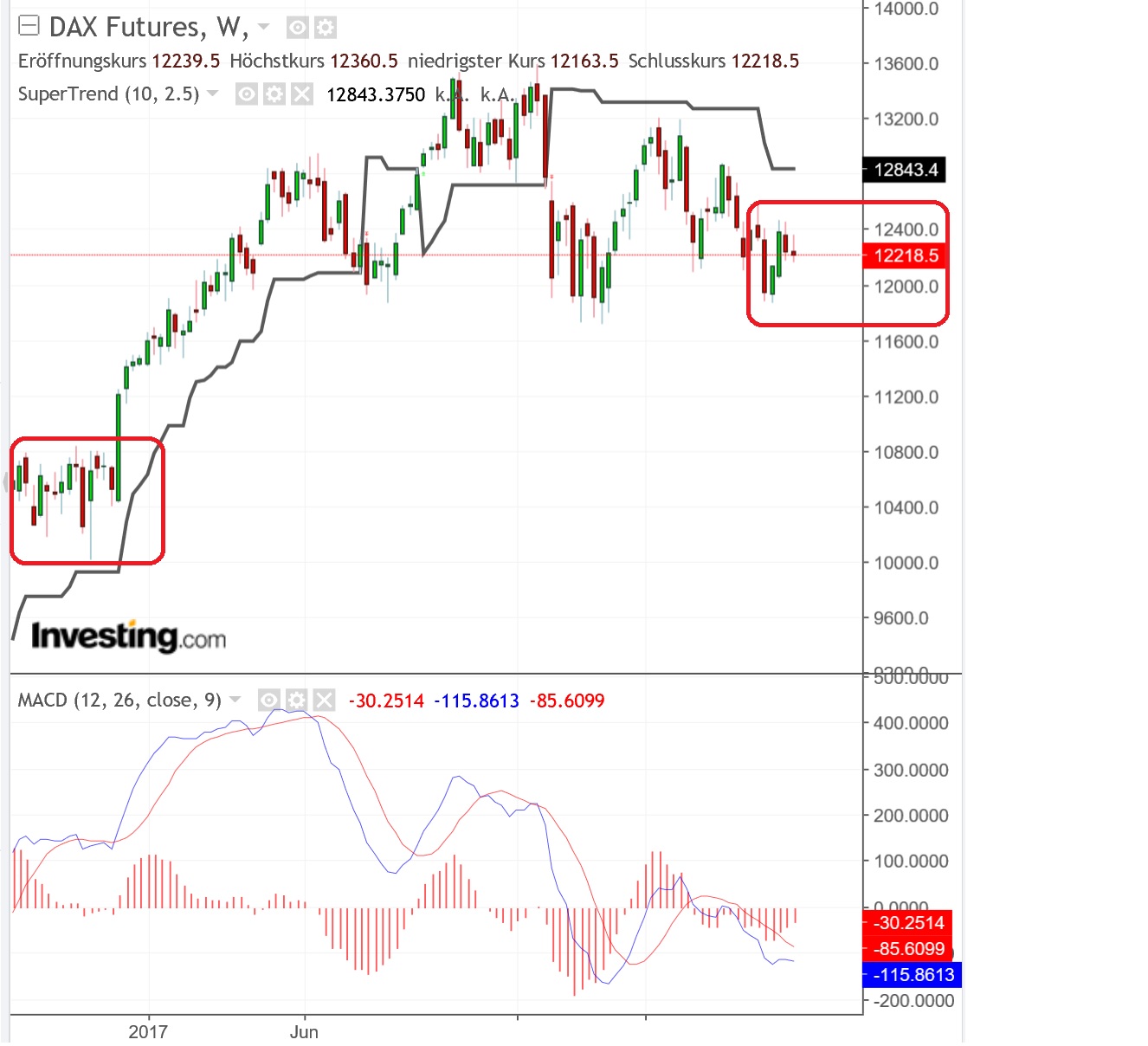 Der DAX war sehr typisch am 61,8 % Widerstands-Retracement 12356 nach unten abgedreht und fast wieder zum Freitagstief 12191 gefallen.