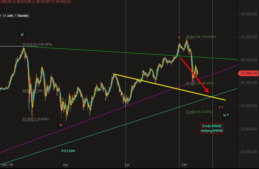 Hält der Bereich nicht, wird sich die nächste Abwärtswelle vermutlich bis mindestens 24.000/23.850 ausdehnen. Auch dort bestünde noch die (letztmalige) Chance wieder nach oben abzudrehen. Allerdings sind dann die Jahrestiefs nicht mehr weit und deren Test wäre vermutlich nicht vermeidbar.