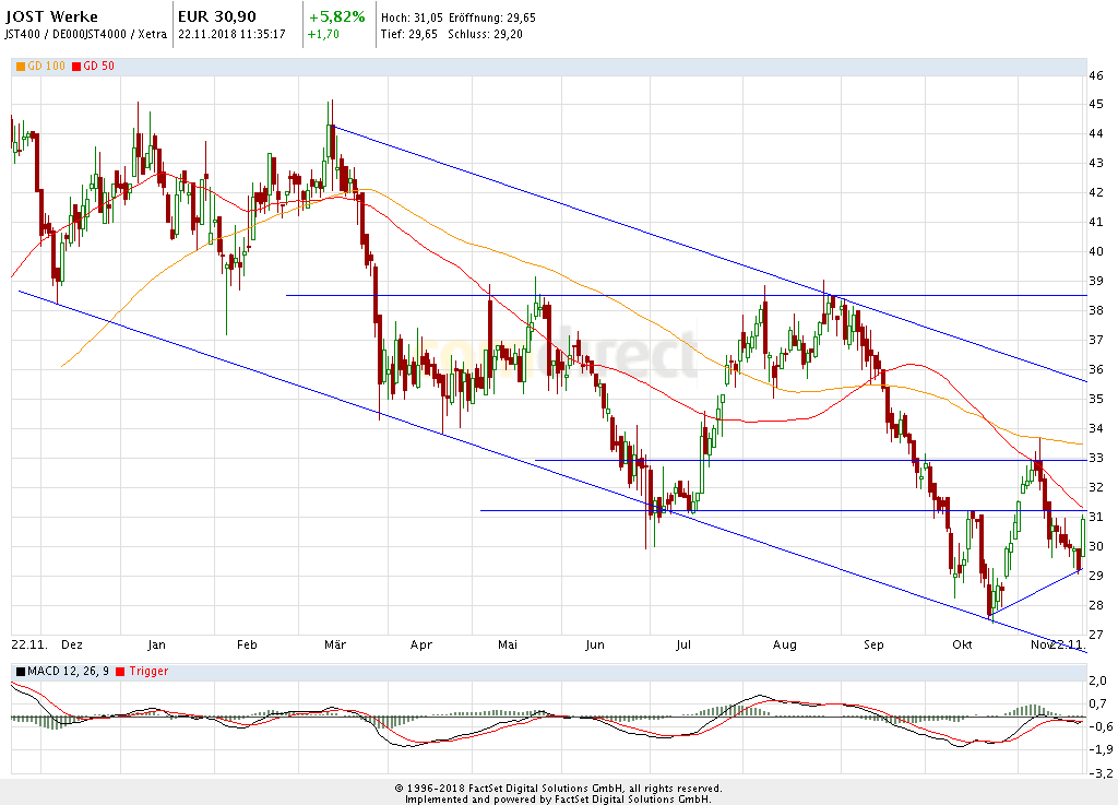 Der DAX® zeigte sich heute etwas schwächer. Die Unterstützung bei 11.080 Punkten wurde jedoch verteidigt. Solange die Zone 11.000/11.080 Punkte hält besteht die Chance auf eine Erholung bis 11.400 Punkte. Kippt der Index hingegen unter 11.000 Punkte droht eine Fortsetzung der Abwärtsbewegung bis 10.790 Punkte."