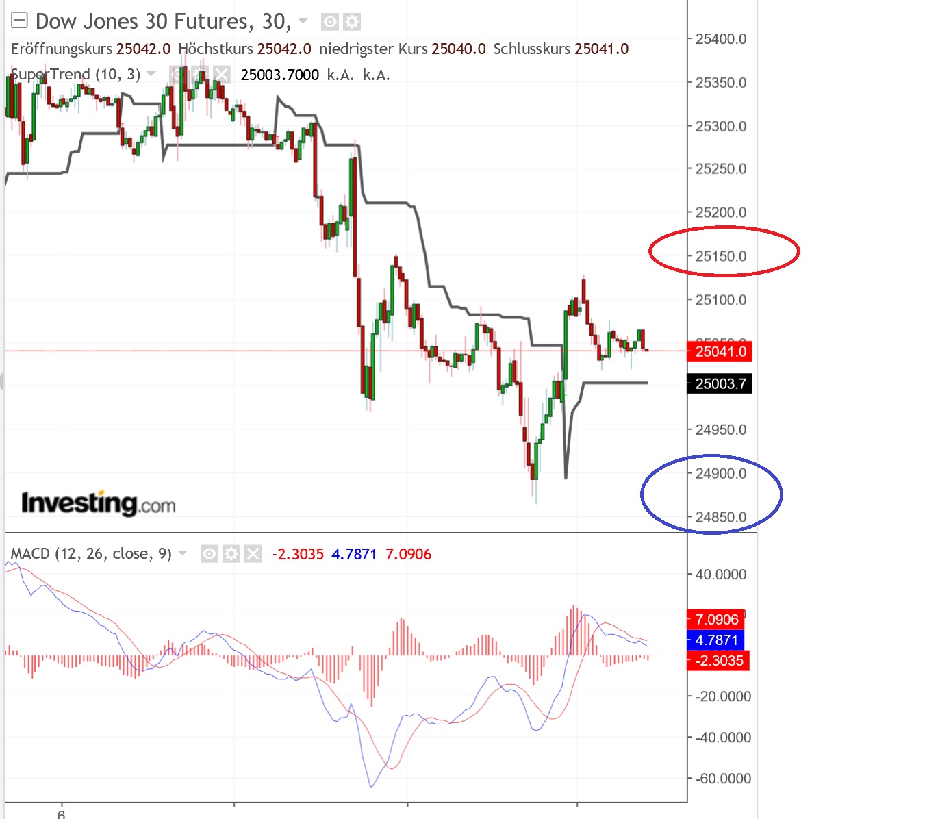 Die Abwärtsbewegung führte dann am Freitag bis 24.883. Das reichte den Bullen aus, um wieder einzusteigen. Auf Wochensicht ist per Saldo nicht viel passiert. Die 25.200 wurde nicht nachhaltig überwunden.