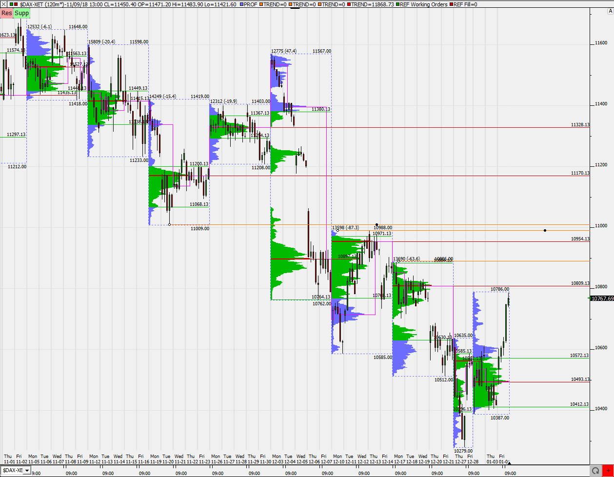 Der Handel „zwischen den Jahren“ ist ohnehin immer mit Vorsicht zu genießen. Viele Marktteilnehmer sind einfach nicht da. Der Algorithmenhandel hat es da besonders leicht. Und so sahen wir auch grasse Bewegungen gleich schon am 24.12.18. Der Dow viel am Heiligen Abend um 600 Punkte auf ein neues Jahrestief, um dann am 26.12.2018 zunächst noch weiter zu fallen (21.713 = Jahrestief von 2018) und dann 1.000 Punkte am Stück zu steigen. Zum Jahresende schloss er dann über der wichtigen Unterstützung 1f bei 23.327 mit einem Jahresminus von gut 6 Prozent.