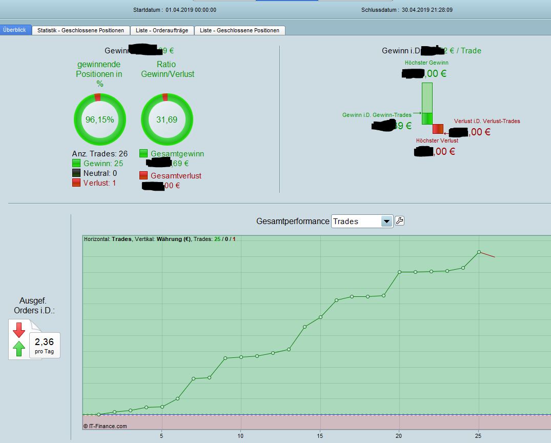Waren aus unterschiedlichen Gründen (freie Tage mit der Familie, wenig(er) Zeit vor dem Chart oder in "Alarmweite" zu sitzen...) gut 20-25% weniger Trades als in einem "normalen" Monat (zumindest in letzter Zeit, ich hatte vor Jahren auch schon Monate mit 300, 400 (ja, die Semesterferien... war ne krasse Zeit!) händischen Trades... irgendwo musste der Sonderstatus bei CC ja herkommen*g*). Lange Rede, kurzer Sinn, es waren diesen Monat auch weniger händische Trades, die ich hätte versemmeln können!