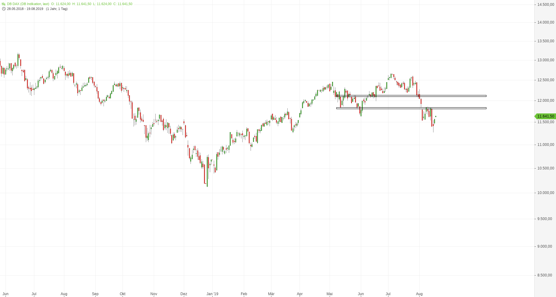 XETRA DAX Tageskerzenchart mit Zielen bei 11651 und 11850/11935